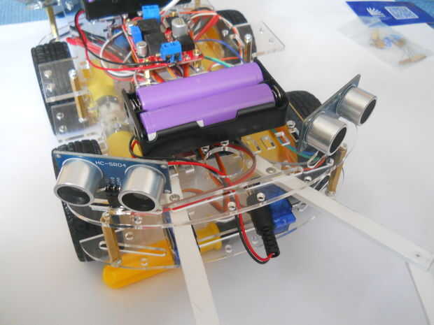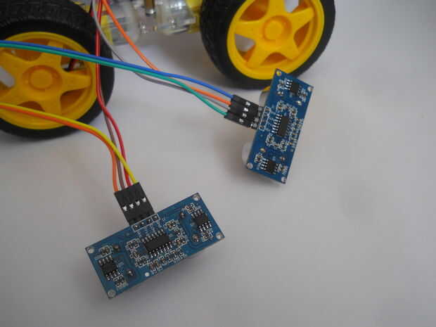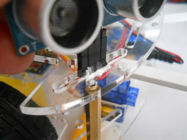 Los sensores de ultrasonidos detecta la distancia entre el obstáculo y el robot. Los pines de señal están conectados a las salidas digitales siguientes: 10, 11, 13, 12. Por supuesto usted debe encender ellos con 5 voltios, entonces con algunos fix adhesivo caliente les en la parte delantera del coche.