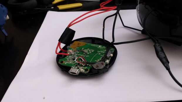 Para obtener el otro altavoz en su lugar, corte el cable de conexión a la placa de bluetooth. Si usted está en él, se pueden simplemente lograr las conexiones en el tablero, pero yo no soy soldar otra vez si puedo evitarlo. Ponga los auriculares y la batería dentro de la oreja derecha y tire de los cables a través del agujero en el centro de la Copa. Vuelva a conectar los cables de auriculares para el chip de bluetooth en la parte exterior de la Copa y conecte la batería. Vuelta que en y hacer una prueba rápida ejecución para asegurarse de que todo está trabajando.