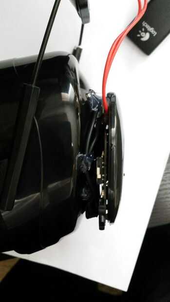 Para empezar, la soldadura de una sola pieza de cable (+) y una pieza diferente del alambre a los terminales (-) del altavoz para el oído izquierdo. A continuación, coloque el altavoz en el auricular y tire de los cables por el agujero que ha perforado en la parte superior de la Copa. Los cables a lo largo de los auriculares y al otro lado. Se puede ver en la foto cómo había metido los cables debajo del acolchado en el puente de los auriculares.