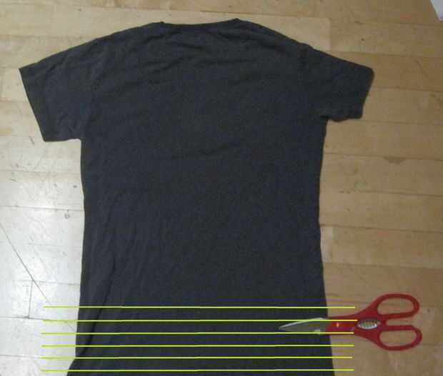 1. corte a lo largo de la anchura de la camiseta para hacer 5 tiras sobre la anchura de la uña del meñique.