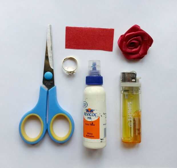 1) la cinta del satén - 0.5-1 pulgada ancho y al menos 10 pulgadas legnth, 2) aguja e hilo, 3) anillo de dedo en blanco, 4) tijera, 5) pegamento (cola blanca o pegamento caliente),