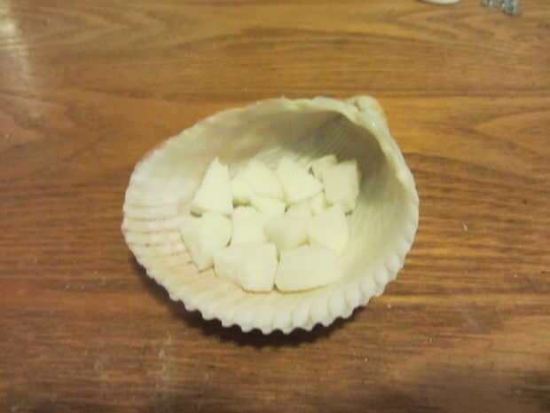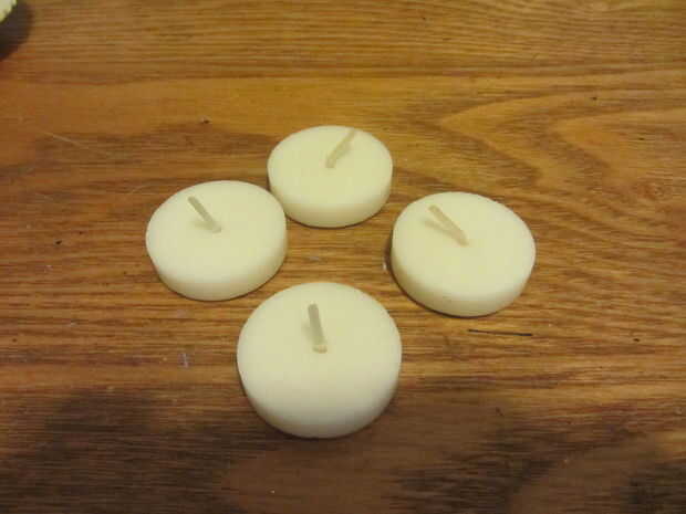 Romper las velas en pequeños pedazos. Cuanto más pequeño eres capaz de hacerlos, más rápido se derretirán. Para este tutorial, he utilizado dos luces de té asi la mecha todavía poder sobresalen de la cera una vez que se reformó.