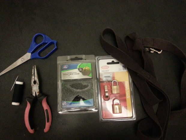 Robo de perro va en aumento! Hay collares de seguros en el mercado pero son caras así que decidí hacer mi propio. Mi versión no es bonito ni perfecto, pero hace el trabajo. Esto funciona del mismo modo pero se ve un poco menos elegante, especialmente con la expuesta cadena y candado. Si usted quiere comprar lo real, www.petloc.com