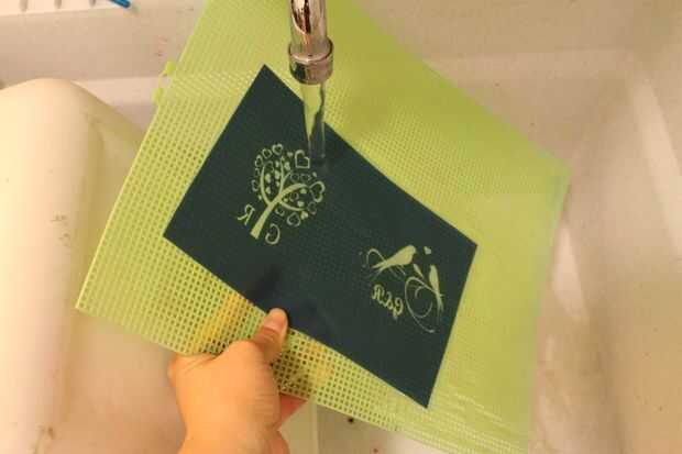 Enjuague la plantilla con un vapor de agua para eliminar cualquier residuo restante. Sostenga la plantilla hasta la luz para asegurarse de que no hay ningún residuo verde luz en las áreas donde debe estar totalmente ido (el área de diseño)