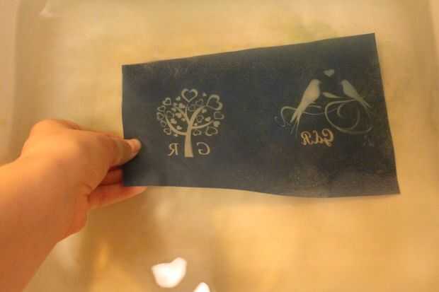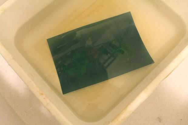 Remoje la plantilla en agua a temperatura ambiente durante al menos 10 minutos (en una zona tenue). Usted verá una imagen fantasma una vez sumergida en el agua. Después de 10-15 minutos, la emulsión comienza levantando la plantilla.