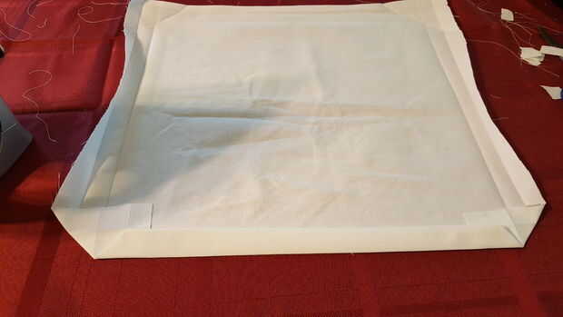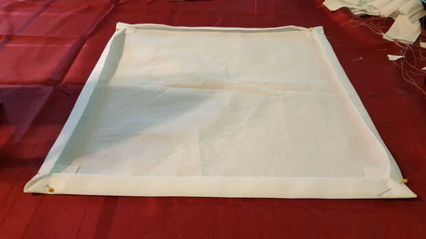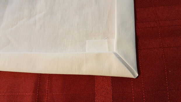 Una vez que todas las esquinas y lados hechos, volver atrás y plegar los lados con los ángulos de la esquina y el hierro otra vez. Prender las esquinas hacia abajo para mantener la forma para la costura.