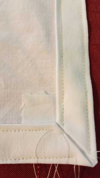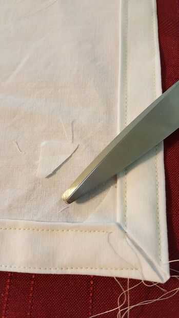Una vez que termines de coser, tienes que cortar las colas de la rosca para que sea agradable y suave. Luego, en la parte inferior de la servilleta tienes estos cuadrados de tela. Cortar la esquina de estos para hacer más agradable mirar.