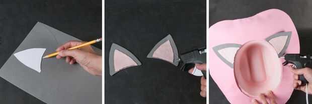 Para crear orejas de Callie, utilice la plantilla de oído más grande para crear dos orejas en la espuma gris. Utilizar la plantilla más pequeña para crear dos orejas más pequeñas en la espuma rosa. Pegamento caliente las piezas de espuma rosada sobre las piezas grises, luego utiliza el pegamento caliente para unir las orejas hasta el borde inferior del sombrero, como se muestra en la imagen de arriba.