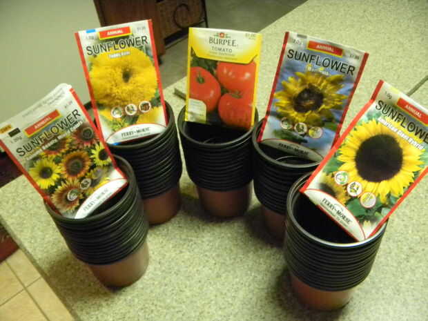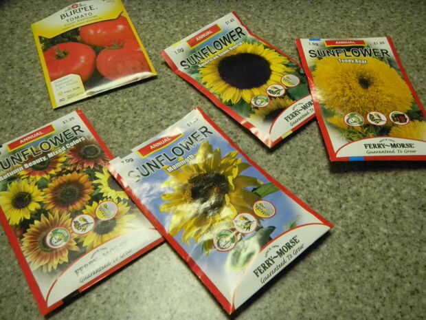 Fui a Home Depot y agarró unas semillas. Tengo cuatro razas de girasoles y una de tomates. Si pude hacer este proyecto de nuevo, que habría recibido menos variedad, en un esfuerzo por mantener las cosas relativamente pequeño y simple para mi primera experiencia de jardinería. Las razas girasol compré fueron: gigante americano, mamut, belleza de otoño y oso de peluche. Las semillas de tomate que compré eran tomates Beefsteak.