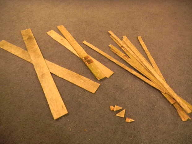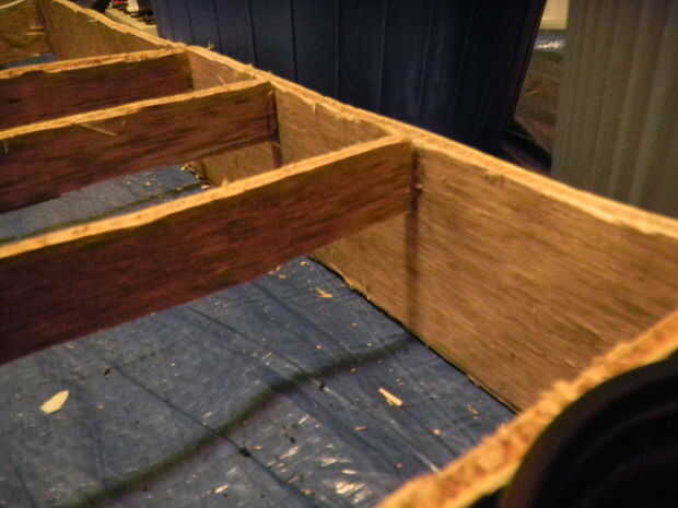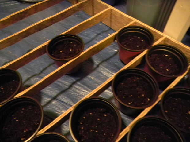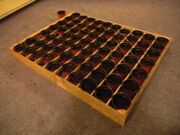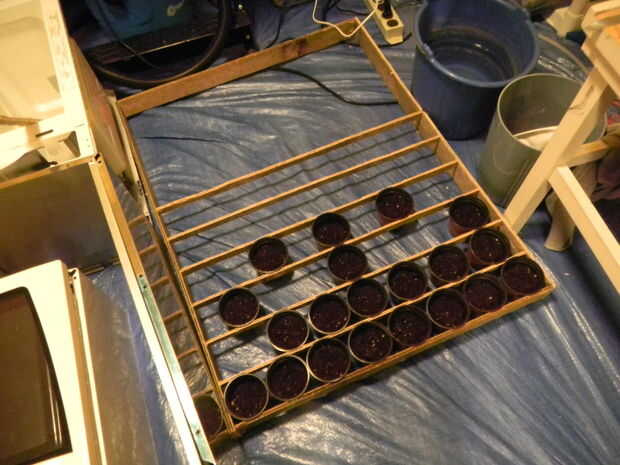 El bastidor fue construido usando 1/8" espesor madera contrachapada, rescatada de una plataforma de madera que encontré hace mucho tiempo. Se llevó a cabo usando pegamento caliente. No estaba particularmente preocupado por la fuerza del marco, ya que sólo sería estar dentro. Las piezas fueron cortadas con una sierra caladora, utilizando las medidas de las macetas pequeñas como guía permitir diez columnas de siete plantas cada uno. Se utilizarán dos columnas para cada especie. Las macetas de colgar ligeramente sobre el piso, equilibrado entre las dos piezas de madera a cada lado. Periódico se coloca debajo del marco para capturar y absorber cualquier exceso de agua.