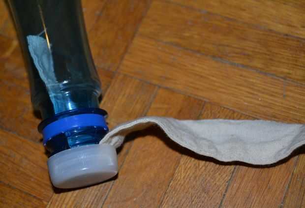 Inserte el pedazo de tela en la tapa de la botella y cerrarla, como en la foto (más apretada de goteo más lento y menos apretada de goteo más rápido).