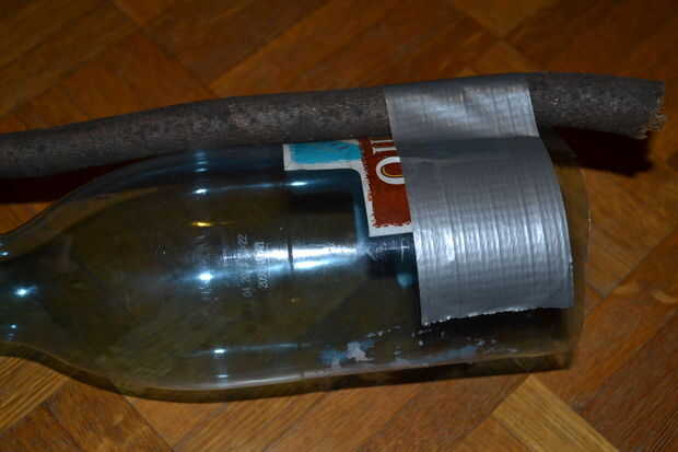 la botella al palo de la cinta. (no debe poner la botella directamente sobre el suelo o el agua no saldrá para la demasiada presión)