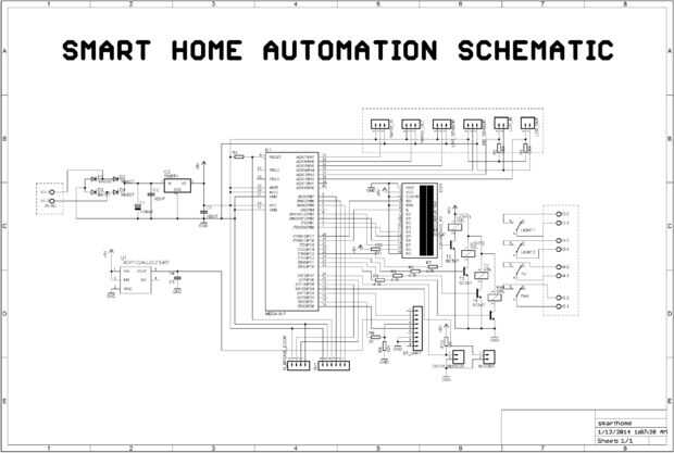 Hay cinco tipos de sensores utilizados en el proyecto que los son ser conectados directamente al microcontrolador. Para el sentido de la intensidad de luz se utilizan dos sensores LDR, que es luz resistencias dependientes conectados a la entrada del ADC del microcontrolador. Uno de los pines de la LDR está conectado a Vcc mediante una resistencia de 330K y otro atado a la tierra. Esto crea una diferencia de potencial entre el circuito y se alimenta a la clavija 3 y A.2 del microcontrolador respectivamente. Para el sentido de la temperatura se utilizaron dos sensores de temperatura semiconductores de estado sólido de dispositivos analógicos también conectados a la entrada del ADC del microcontrolador. Los dos pines están conectados a la fuente de alimentación a los sensores y el tercer pin es el pin de salida está conectado al ADC7 y ADC6 canal del microcontrolador. Para detectar las fugas de LPG en el hogar usamos el sensor GLP MQ-5 y es la interfaz a la entrada del canal ADC5 del microcontrolador. Cuando se detecta una fuga de LPG la salida del sensor de LPG de disminuir poco a poco y eso es ser detectado por el ADC del microcontrolador. Después de ellos, utilizamos un gancho conmutador para detectar la puerta si se abre o cierra. Este sensor se conecta a la clavija de entrada digital D.7 del microcontrolador que desde el exterior se levantó. Cuando la puerta está cerrada, se cierra el interruptor del gancho y la salida es la lógica baja que circunvala la tierra. Cuando la puerta está abierta, también está abierto el interruptor de hool y puentes logic1 pensamiento 10k resistencia a la salida. Para el sentido de la presencia y movimiento utilizamos el sensor de PIR (infrarrojos piroeléctrico) que tiene una salida digital y también está conectado a la entrada digital (pinA.4) del microcontrolador que desde el exterior se levantó. Cuando se detecta un movimiento, la salida va alta por unos segundos y vuelve a la baja en caso de ausencia de movimiento. La puerta principal es conducida por el motorreductor DC y como cerrar y abrir la puerta, tiene que ser movido bi-direcionally. Para ello, hemos utilizado las cuatro NPN BC107 transistor basado en circuito de puente H bidireccional controlador de motor conectado a la salida digital del microcontrolador. El microcontrolador puede controlar digitalmente el movimiento y la dirección del motor para abrir y cerrar la puerta. Para mostrar mensajes y sensor de valores de un carácter de 16 x 2 que LCD se utiliza en modo de 4 bits a portB del microcontrolador.
