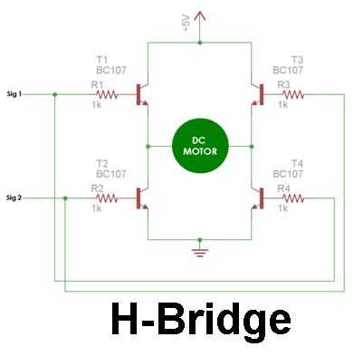El circuito puente H se utiliza para conducir un motor de corriente continua en ambas direcciones. También pueden utilizar relés para funcionar, pero aquí utiliza el BJT en base uno. Se compone de cuatro transistores BC107 NPN como se muestra en la figura 2. Los dos transistores T1 y T2 están en serie y los T3 y T4 también en serie. La base de los cuatro transistores actual protegida y limitan resistencias R1-R4. El evitar dañar los transistores. Las señales de la base de T1 y T4 son los mismos y la de T3 y T2 también son los mismos. El funcionamiento es sencillo que cuando Sig1 es lógica 1 y 2 de Sig es lógica 0, a su vez en T1 y T4 y girará el motor en una dirección, mismo si invertimos la entrada lógica, la voluntad del motor van en la dirección contraria. Los cuatro transistores se utilizan como simples interruptores aquí.