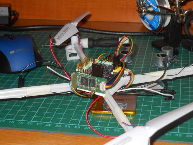 Utilice cinta de doble cara y agregar primero el GPS. Esta cinta de esponja tiene todo en su lugar, así que el pegamento cada módulo uno por uno en la pieza de plástico. Si terminas con este puede conectar pines del controlador de motor a la MultiWii.