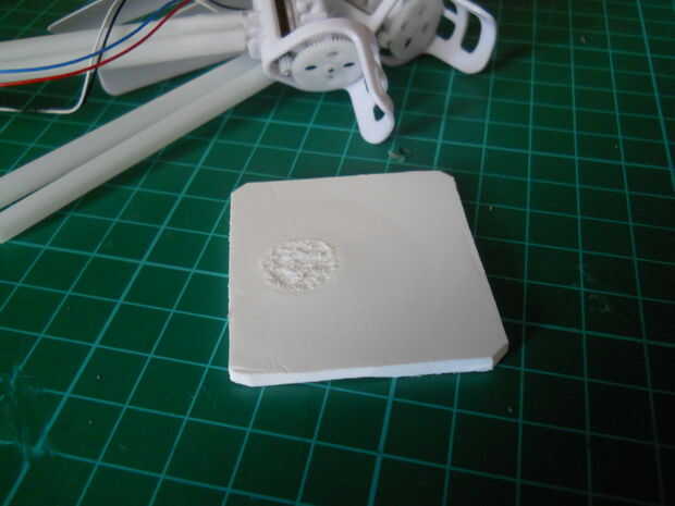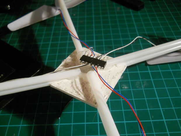 Por favor la atención en la segunda foto, que muestra cómo equipa el proppelers del dolor. Utilice pegamento caliente y pegamento para todos cuatro propulsores luego revise las conexiones. Es muy importante que el proppelers tiene que ser por la misma distancia unos de otros.