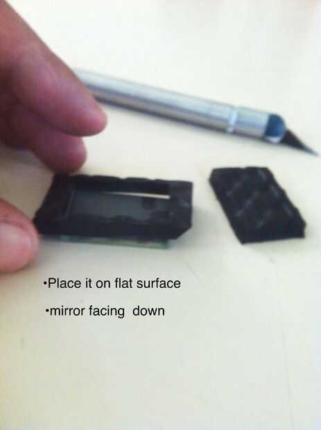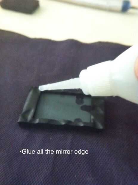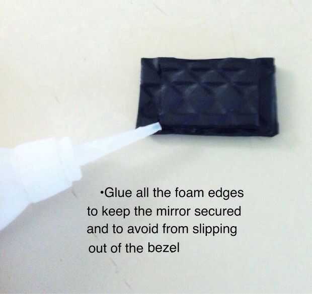 5 ajuste su espejo en bisel que acaba de hacer, si cabe correctamente., colóquelo sobre una superficie plana y pegue todos los bordes del espejo bisel de espuma. Y cubre la parte posterior del espejo con su corte exceso de bisel que acaba de hacer. (como se ve en la imagen).