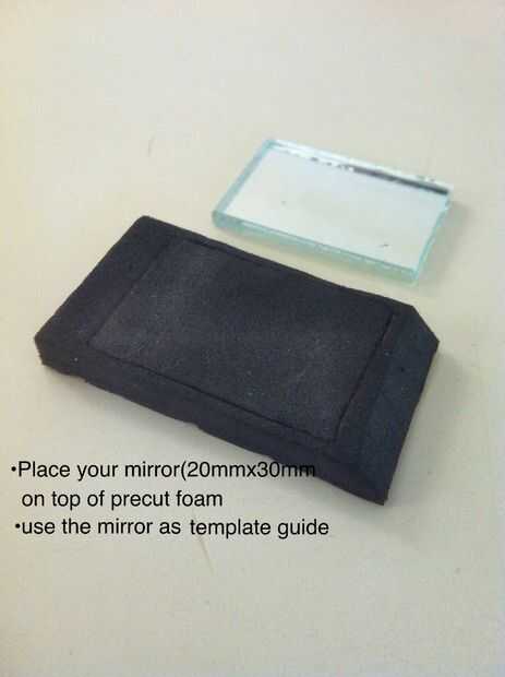3 Coloque su espejo de corte 20 mm x 30 mm como guía de la plantilla encima de la espuma 25mmx45mm. Marcar la espuma usando espejo como su guía de plantilla.