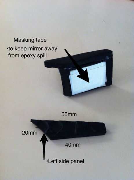 6.Use el espejo en bisel como guía de plantilla para la preparación de su cuerpo. Importante poner cinta adhesiva en el espejo para cubrir todo, para evitar derrames accidentales de epoxy en el espejo mientras el cuerpo entero del bisel.