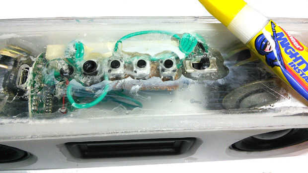 3.) Hacer la caja más hermética rellenando los huecos del botón con pegamento caliente.