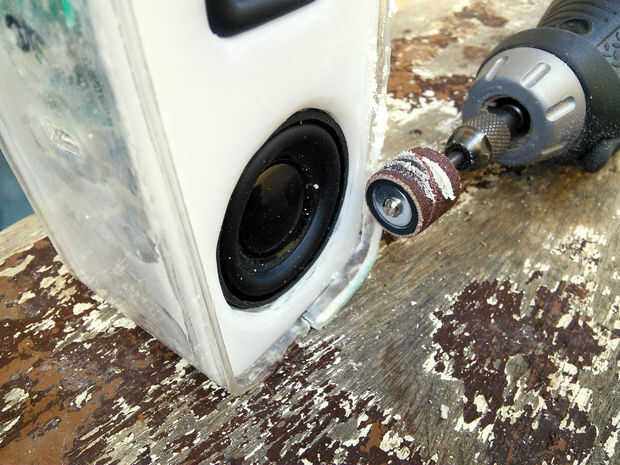 Utilizar la útil herramienta giratoria para moler de los afilados que sobresalen de los bordes. No te detengas hasta lograr una superficie plana. Recuerda, el pegamento utilizado para atar el acrílico funciona como relleno (masilla). Oculta los huecos después de lijar.
