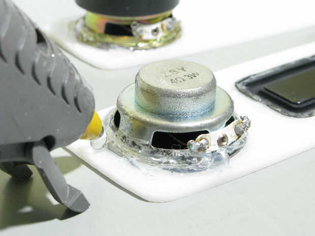 Muy bien, esta parte es crucial. Para lograr ese rendimiento de bajos potente, debe mantener a su altavoz BT 100% hermético. Aplique suficiente cantidad de pegamento en la superficie del acrílico (área de altavoz) para asegurarse de que usted ha sellado los huecos. Aplicar cantidades minuciosas de pegamento caliente alrededor de los controladores de altavoz y radiador pasivo.