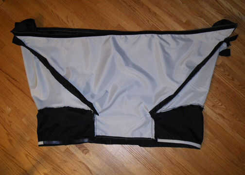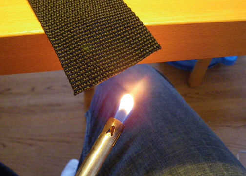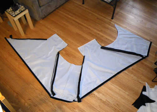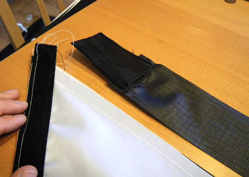 Como se muestra en las imágenes, se unen las piezas. Cuando el lado en el panel frontal y posterior, utilice una tira de nylon (usa el negro, pero sugeriría usar blanco si lo tienes) para crear un 'túnel' guía más adelante el poste de la tienda. En el fondo de este túnel, he añadido un trabajo pesado 2" pedazo de ancho de cinta (derretimiento extremos para no fray) - es uno de los lugares que más desgaste (aceptando el extremo del poste).