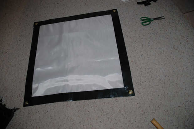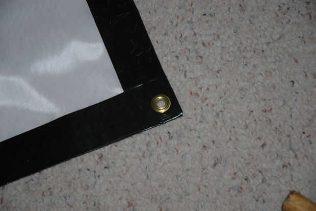 Acabado del panel frontal. Aquí mi teoría es que los gromments van hacer espigas que salen de los postes de la carpa y mantener todo cuadrado.