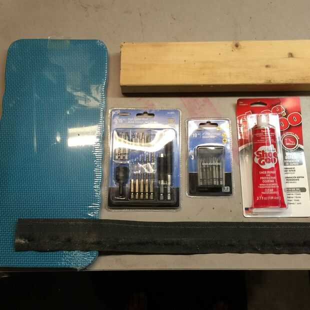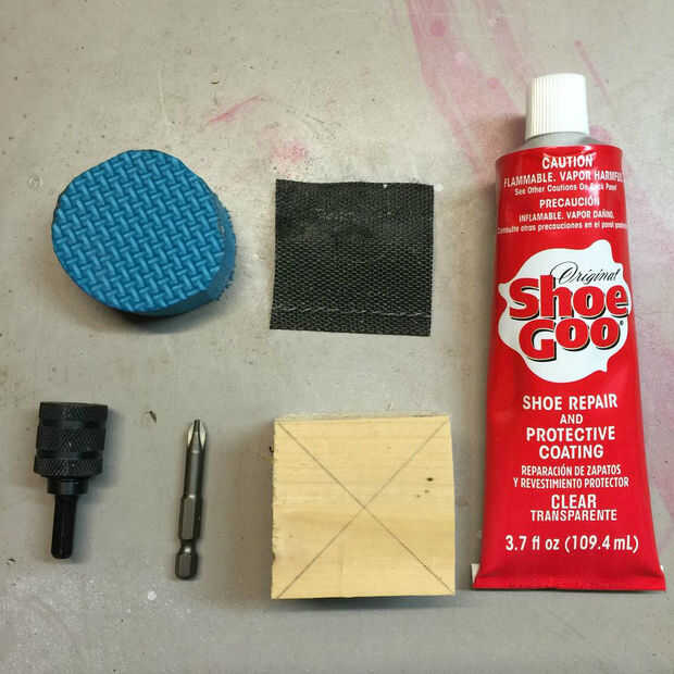 Compré los bits y de desconexión rápida de puerto de carga y la almohadilla jardinería y Shoe Goo en mi ferretería local. La 2 x 4 y 2" Velcro tenía alrededor de la tienda. Una vez que ha hecho como muchos titulares de almohadilla lijadora como usted podría desear te tendrá materiales adicionales. La almohadilla de jardinería trabaja mucho para amortiguar mandriles de madera personalizados y Shoe Goo es un gran adhesivo flexible para tener en la casa.