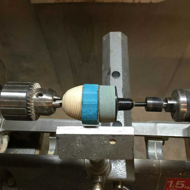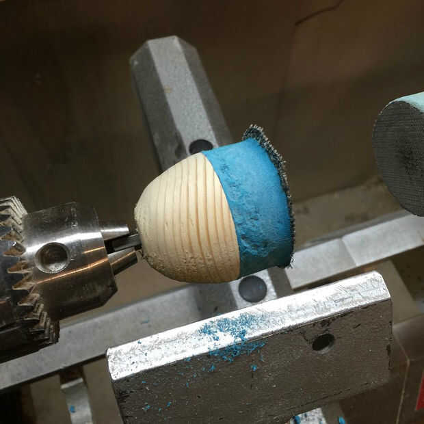 Regresé el conjunto pegado para arriba al torno y utilizar una vez más mi viejo soporte lijado como guía de tamaño. Una razón adicional que utiliza la base de lijado extra fue aplicar ligera presión a la Asamblea para mantener juntos. No espero mucho tiempo el pegamento se seca así que no podía doler un poco de seguridad extra. Utilice una herramienta recién afilada a la espuma a su forma final, no molesta tratando de cortar la cinta de Velcro en el torno. Una vez extraído el torno utilice unas tijeras para recortar el Velcro y darle un aspecto acabado.