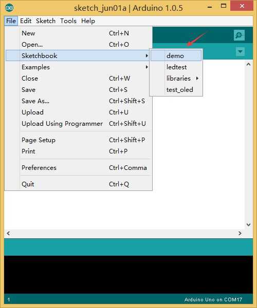 4. cierre y vuelva a abrir el IDE de Arduino, haga clic en File > Sketchbook > demo, a continuación, el código principal de la mesa está abierto.