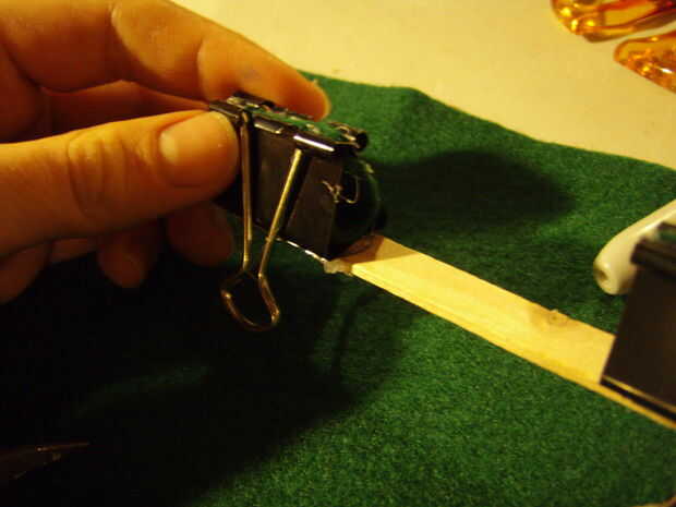 Utilizando algún pegamento flexible, pegamento de los clips de la carpeta para cualquiera de los extremos del palito.