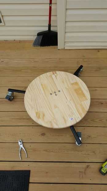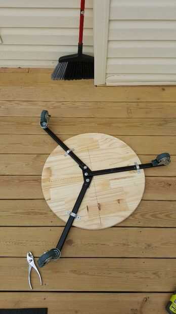 Ahora toma las ruedas y conectado a la pieza redonda de madera. Te recomiendo poner las ruedas como si se tratara de un triángulo. Esto ayudará a distribuir el peso de la bicicleta más tarde.