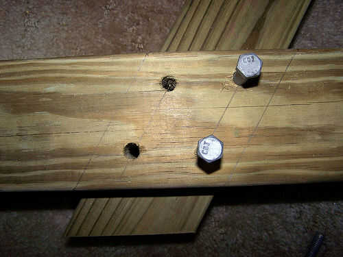 Las vigas de ángulo se "intercaladas" entre las dos vigas de 8' y los pernos pasará por todas las tres piezas. Para asegurarse de que tenía un agujero recto para el perno que pasar por los tres que establecidos los tres cuatro piezas en el piso tal como lo harían al estar de pie y perforado una vez a través de la madera. Como veis en la foto hice los agujeros de 1" de los bordes.