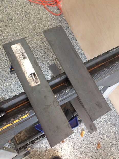 - Corte la placa de metal y tubería a la medida. Se puede usar una sierra de mano para esto, pero que tomaría para siempre. No tengo una amoladora (todavía), pero tuve un corte rueda (similares a este) para mi sierra circular de metal. Hacer las marcas con un rotulador según sus planes, el metal y algo robusto, corte a la abrazadera. He encontrado útil tomar un archivo grande y moler abajo cualquier burs que quedaron después del corte.
