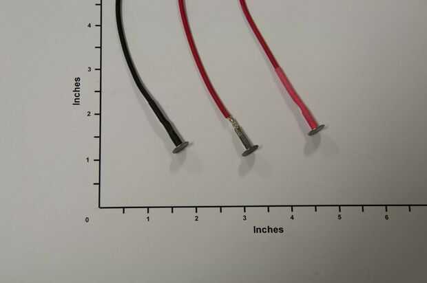 Inicialmente trató de soldar cables directamente a los muelles y a los contactos de linternas viejas, pero encontraron esto para ser ni fácil ni muy práctico, así que decidí hacer lleva como componentes separados que pueden usarse indistintamente en varias configuraciones. Clavos galvanizados para techo resultaron perfectos contactos para los conductores. Retire la capa de zinc de la cabeza del clavo con papel de lija o un cepillo de alambre, cortar la caña de la uña a ½" a ¾" de longitud y de la soldadura en el cable de conexión. Utilicé cable de 18 AWG trenzado porque tengo mucha y se trata del mismo diámetro que el clavo, pero más pequeño alambre probablemente funcionará igual de bien. Algunos de los conductores se muestran en la foto anterior.