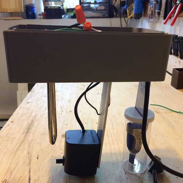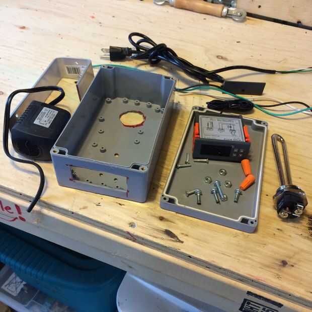 Como se puede ver también necesita hacer dos agujeros para el termostato y el elemento calefactor. Medí el tamaño se cada elemento y usar una herramienta dremel cortan los agujeros a la medida. El termostato tiene dos clips de naranja que después deslícelo en el cuadro de proyecto para bloquear en lugar. El elemento calefactor encajo tan apretado como podía y usa una pistola de pegamento para sellarlo. Que dices, que el pegamento se derrita!!! Como el calor se transfiere al agua lo hace bastante bien. La próxima vez que utiliza un anillo de metal para bloquearlo y no confiar tanto en el pegamento pero hace el trabajo!
