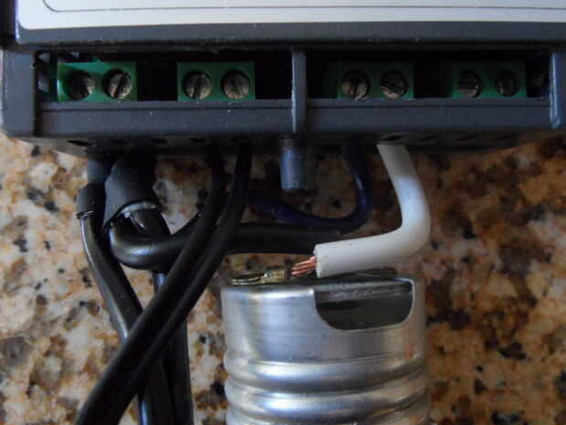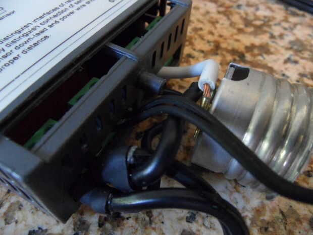 Ya que todos estamos haciendo simplemente es interrumpir un circuito, estamos efectivamente jugar sólo con un cable en la instalación. Esto se ve en la serie de fotos en esta sección. Tenemos el poder de enchufe que va en la potencia de entrada terminales, pero hemos también por cable lo hasta ejecutar el adaptador, y la otra a los terminales de potencia de salida. Entonces, solo tengo que ejecutar un cable desde el terminal de potencia de salida para el adaptador. Agregar el sensor en el centro, y eres bueno para ir!