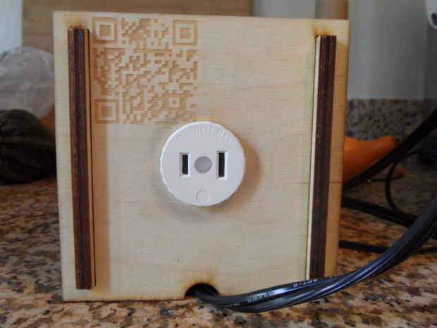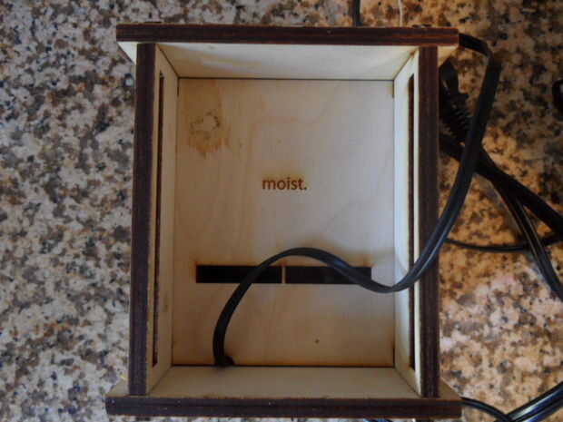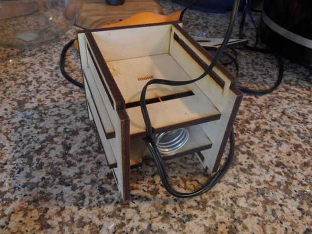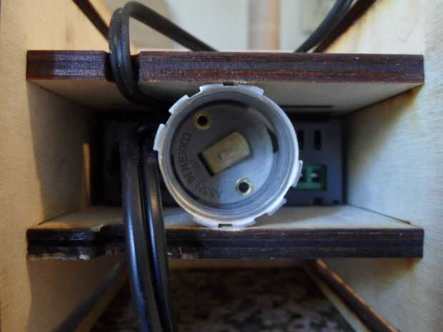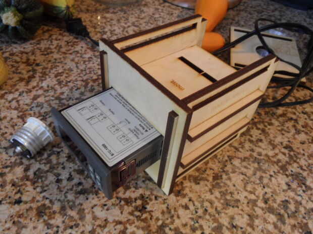 Una vez que tienes todo atado con alambre para arriba, seguir adelante y sólo Deslice el regulador de PID en la parte frontal de su caja de madera. Será un ajuste perfecto, así que suave. Una vez, tire el adaptador por lo que las fichas son justo en el borde trasero del panel. Esto es importante porque actuará como el único tornillo en la configuración cuando atornille en el adaptador actual. Atornillar el adaptador hace fichas de salida en la madera, permitiendo que el panel posterior que se celebrará cerrado.