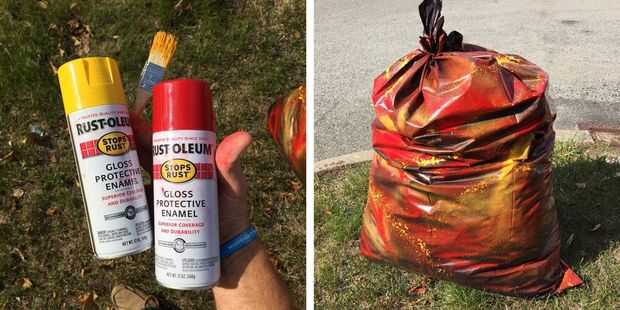 Una vez que la bolsa de basura tiene su forma, usar las pinturas de aerosol rojas y amarillas para cubrir la bolsa - alternando los dos colores. No cubrir completamente la bolsa; permitiendo algunos de negro al máximo a través de añadir a la autenticidad de su roca del espacio.