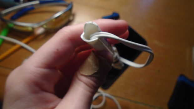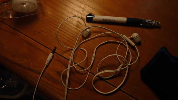 Usé auriculares vieja que no funcionaba, cortar el cordón y grabado en el lápiz, así que puede ir en los auriculares de su dispositivo para que no lo pierdes, también arrancó la parte superior de la pluma así que puedo poner el cable allí cuando no está en su uso.