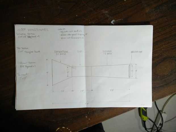 Este diseño es para un túnel de viento abierto retorno como se describe aquí, que es el mismo estilo que el original túnel de viento de los hermanos Wright. Tiene un ventilador en un extremo para sacar el aire el túnel y pasar por el modelo. Sensores se montan para contar cómo el modelo reacciona: un sensor para medir la elevación, un sensor para medir el arrastre. Se compone de tres secciones: