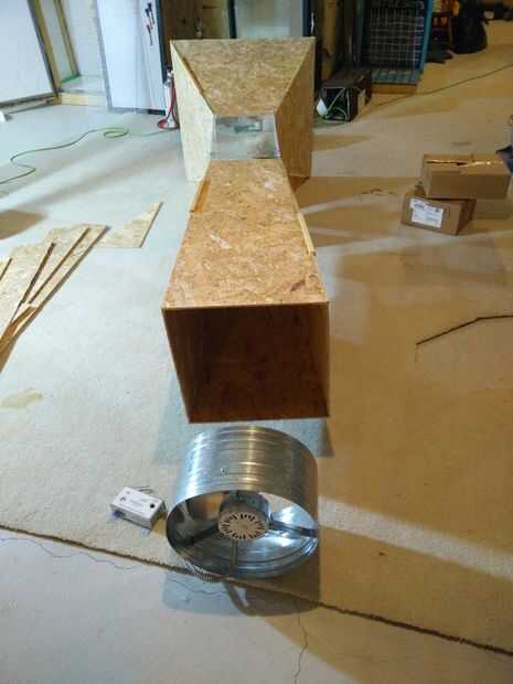 Esta sección contiene el sensor de velocidad del ventilador y el viento. Otra vez, basado en información del libro anterior, la sección de la unidad (gran final) debe ser 2 a 3 veces el área de la sección de prueba (extremo pequeño del difusor), con mejores resultados si la relación es 2:1. Como resultado es fácil de calcular la sección de unidad 17 "x 17" (en 289 ^ 2: 144 en ^ 2 es de casi exactamente 2:1). Esta sección será 4' - 0" de longitud para dar el túnel entero de una longitud de 8' - 0".