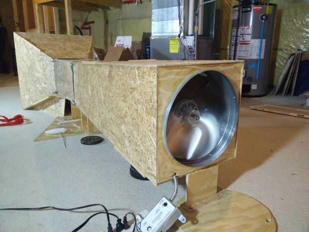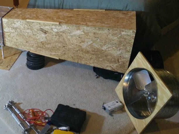 Como con el cono de contracción, construir una base para que el difusor funciona a lo largo del mismo eje de contracción y prueba la sección. Utilicé restos de madera para ello. Algunas medidas deben tomarse para garantizar que se alinea como a como sea posible. La base del difusor será un poco más difícil ya que ambos extremos tendrá que ser levantado, donde la entrada del cono de contracción puede descansar sobre el piso.