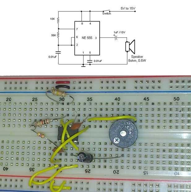 He encontrado un circuito de timbre (http://electronic-circuits-diagrams.com/alarmsimages/alarmsckt5.shtml) el circuito más fácil y simple pudo encontrar y lo probé en el protoboard. Funcionaba bien, pero he cambiado la resistencia de 10k (pines 7 y 8 de la 555 IC) para un resistor de k 180 porque me gustó el tono mejor.