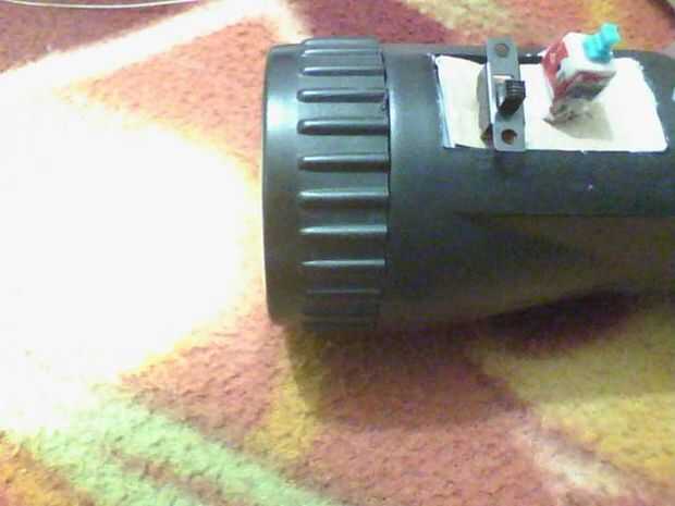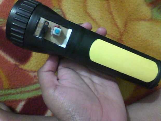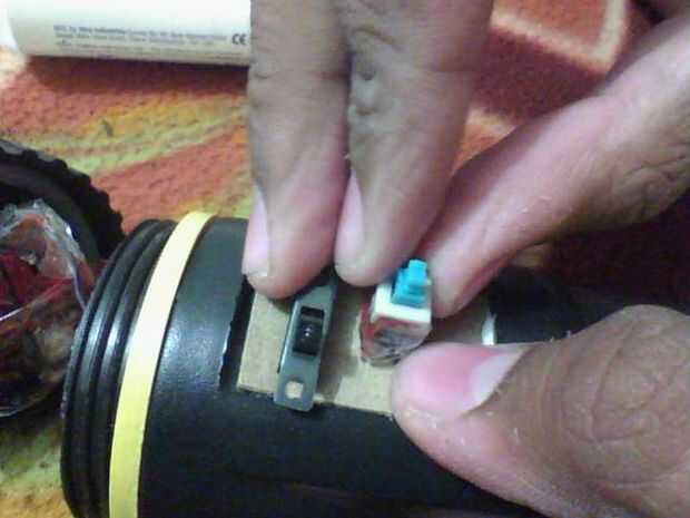 En primer lugar la batería y colóquela cuidadosamente dentro del cuerpo de la antorcha y lo pegamento caliente...