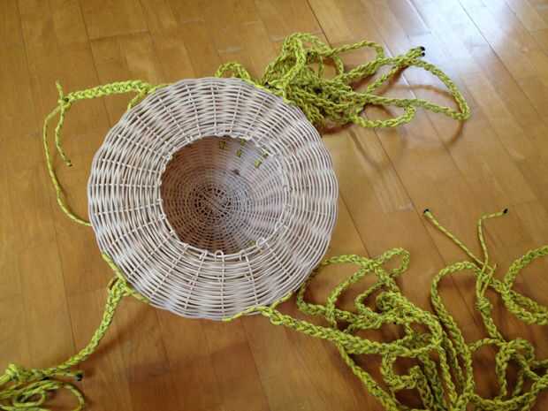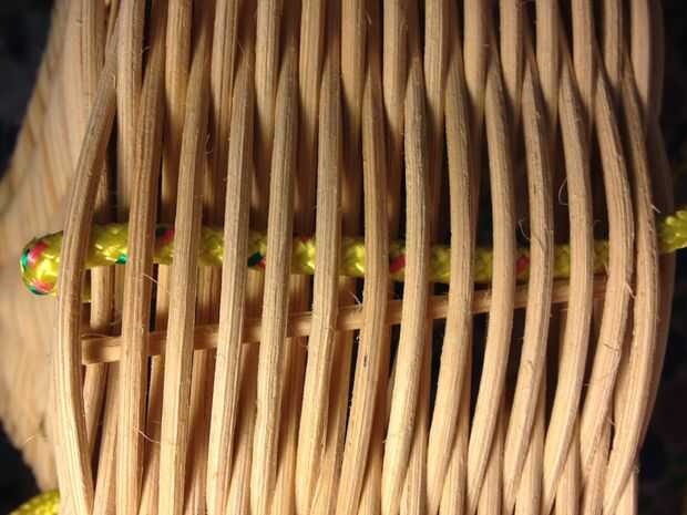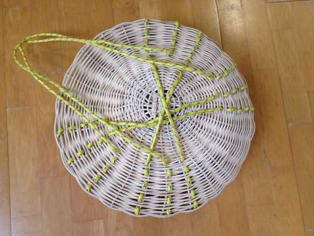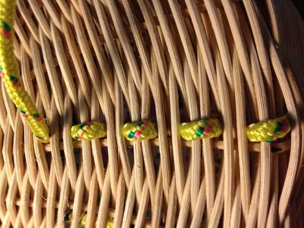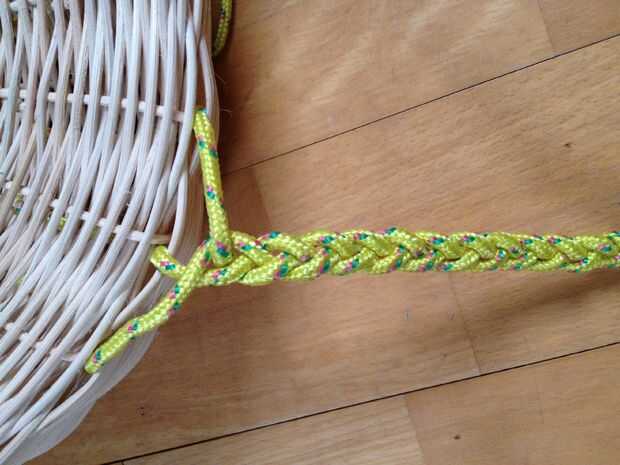 La fila de las cuerdas en dos pares de tres, por lo que se debe cruzar el asiento seis veces. Dejar 2 untightend cuerdas cruzadas para crear un asa para transporte.