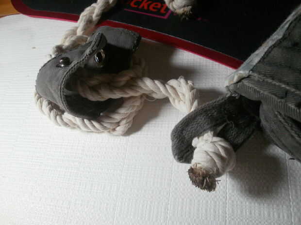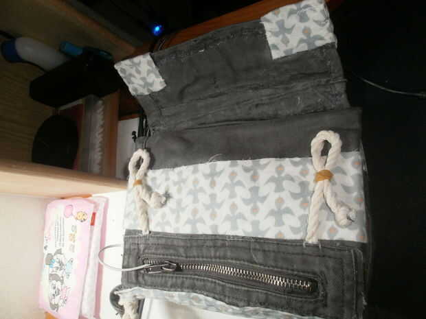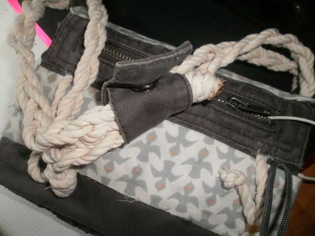 -Por último, me cosió algunos bucles a ambos lados de la bolsa y añadió trenzados juntos unos 3 pies de longitud de la cuerda. También he añadido un pequeño trozo de tela con un botón para que pueda subir los extremos de la cuerda y hacer una correa más corta en el bolsillo.