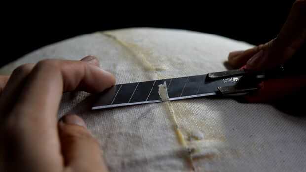 Después la maché de la lona se seque, puede observar que hay hojas superpuestas de tela. Usted puede simplemente plano lo con una cuchilla afilada. Superficie más suave = paseo más liso.