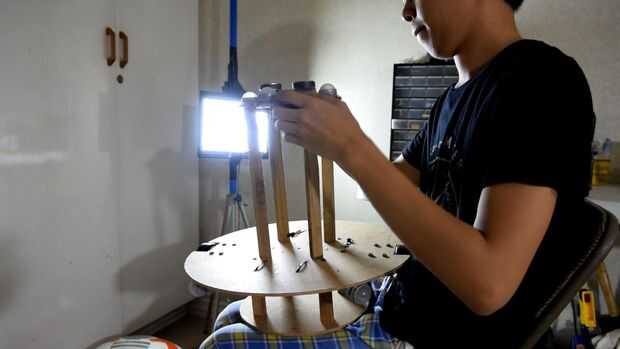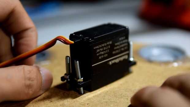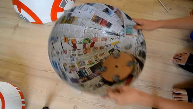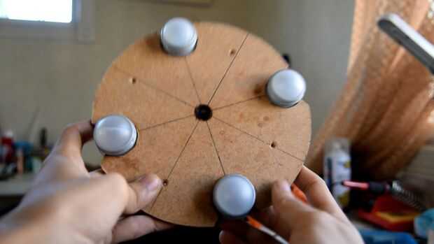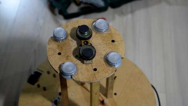 BB8 tiene un mecanismo magnético que mantiene la cabeza erguida. Tiene un interior y exterior. En mi diseño, caliente pegué cuatro desodorantes roll-on (como mis rodillos improvisados) en una placa de madera redonda. A continuación os adjunto un servo con dos grandes imanes que se le atribuye. La placa se monta en la base con cuatro varillas de madera alargadas.